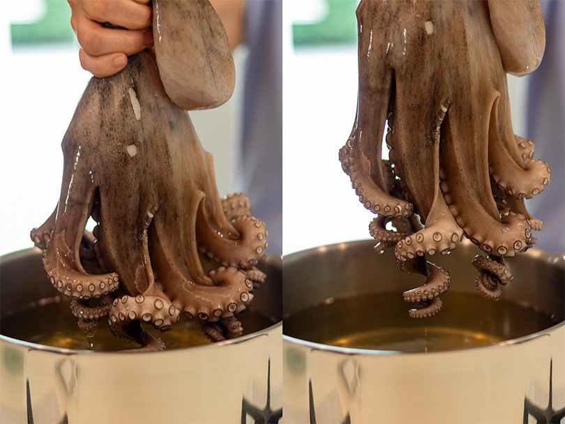 • Arrivata a bollore, prendere il polpo dalla testa ed immergetelo per tre volte consecutive come si fa con il biscotto nel tè, questa operazione servirà ad arricciare i tentacoli e a farli ammorbidire. Tra una calata e l’altra attendete 30 secondi.