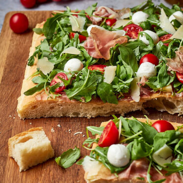 - Appena sarà pronta, sfornate e condite con delle fette di prosciutto crudo, spargete la rucola su tutta la superficie, aggiungete i pomodorini, le mozzarelline e le scaglie di grana a piacere. Infine, condite ancora con qualche ciuffetto di crudo e un filo d'olio extravergine d’oliva. Servitela calda.